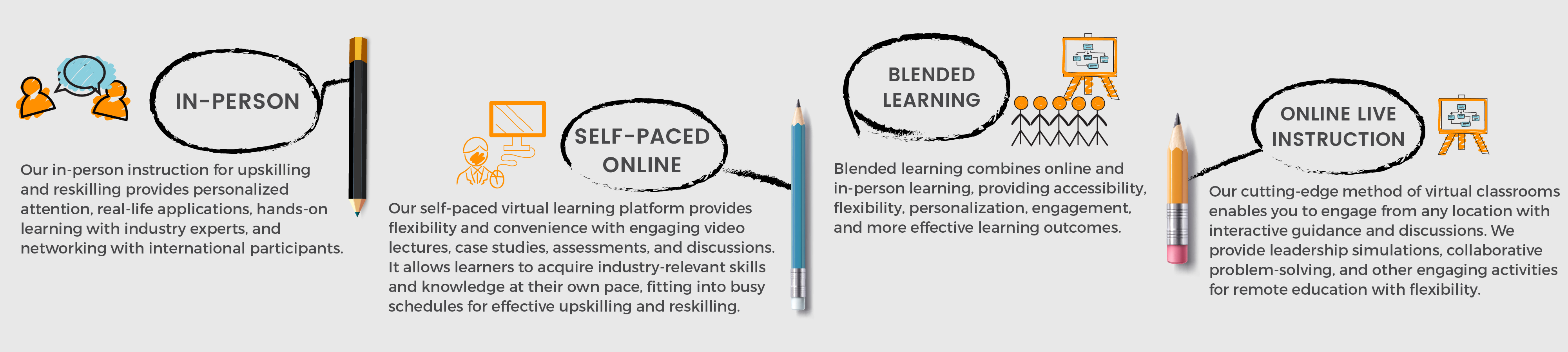 Our Delivery Methods for developing essential competencies are designed to provide ongoing learning opportunities, share global best practices, and enable practitioners from diverse backgrounds globally to participate, offering flexibility to access courses at any time.